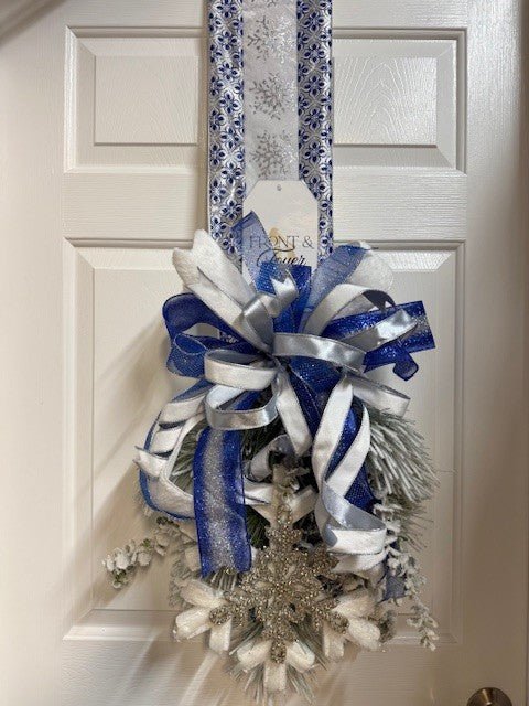 Welcome guests with frosty charm using this dual-purpose Winter Blues Front & Foyer door swag. Featuring elegant snowflake designs in cool winter tones, it works beautifully on your front door to greet visitors while creating a cozy seasonal vibe visible from inside your home. Perfect for the holiday season through winter's end, this versatile piece combines the best of both worlds—a wreath-inspired accent that bridges your indoor and outdoor décor. Celebrate the season with style that's seen and appreciated from every angle.